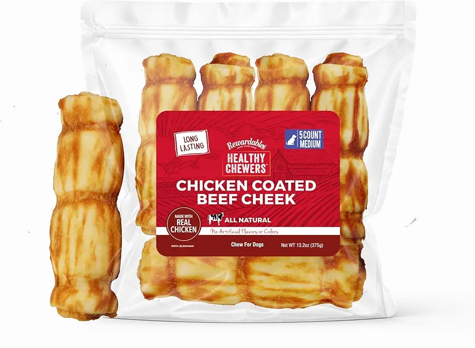 Rewardables Chicken Coated Beef Cheek Rolls for Dogs (Medium) – 5-pack of flavorful, long-lasting chews.
